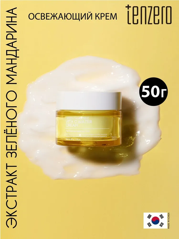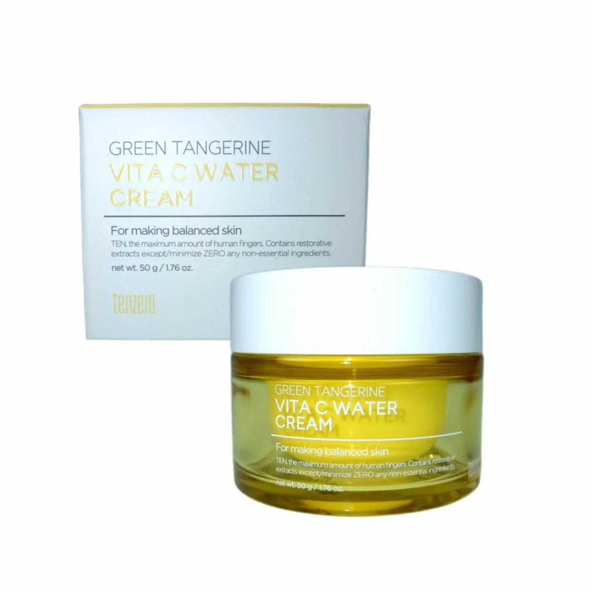 TENZERO Green Tangerine Vita C Water Cream, 50g. Антивозрастной корейский отбеливающий крем для лица с экстрактом зелёного мандарина обновляет, смягчает, придает сияющий вид и глубоко увлажняет. Экстракт зелёного мандарина — это кладезь натурального витамина С, который повышает упругость и эластичность эпидермиса, разглаживает мелкие морщинки и неглубокие кожные заломы, тонизирует и укрепляет, стирает признаки усталости, предотвращает преждевременное старение. Для уставшей и тусклой кожи. Аллантоин стимулирует обновление клеток, а также выработку собственного коллагена Грейпфрут обеспечивает сужение пор. Так же рекомендуем использовать с другими средствами по уходу за лицом и телом марки Tenzero / Тензеро.